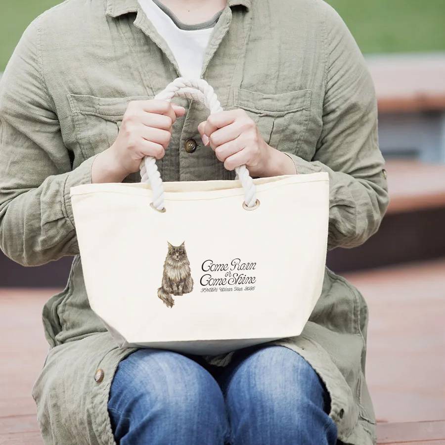 奥村伸二の愛猫、メインクーン「雨」のプリントを中央に配置したバッグ。お散歩バッグにも、ランチバッグにも、ライブの際に貴重品だけを手元に置くのにも使えるサイズです。